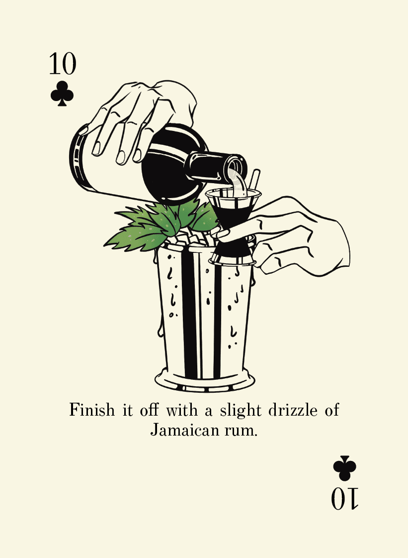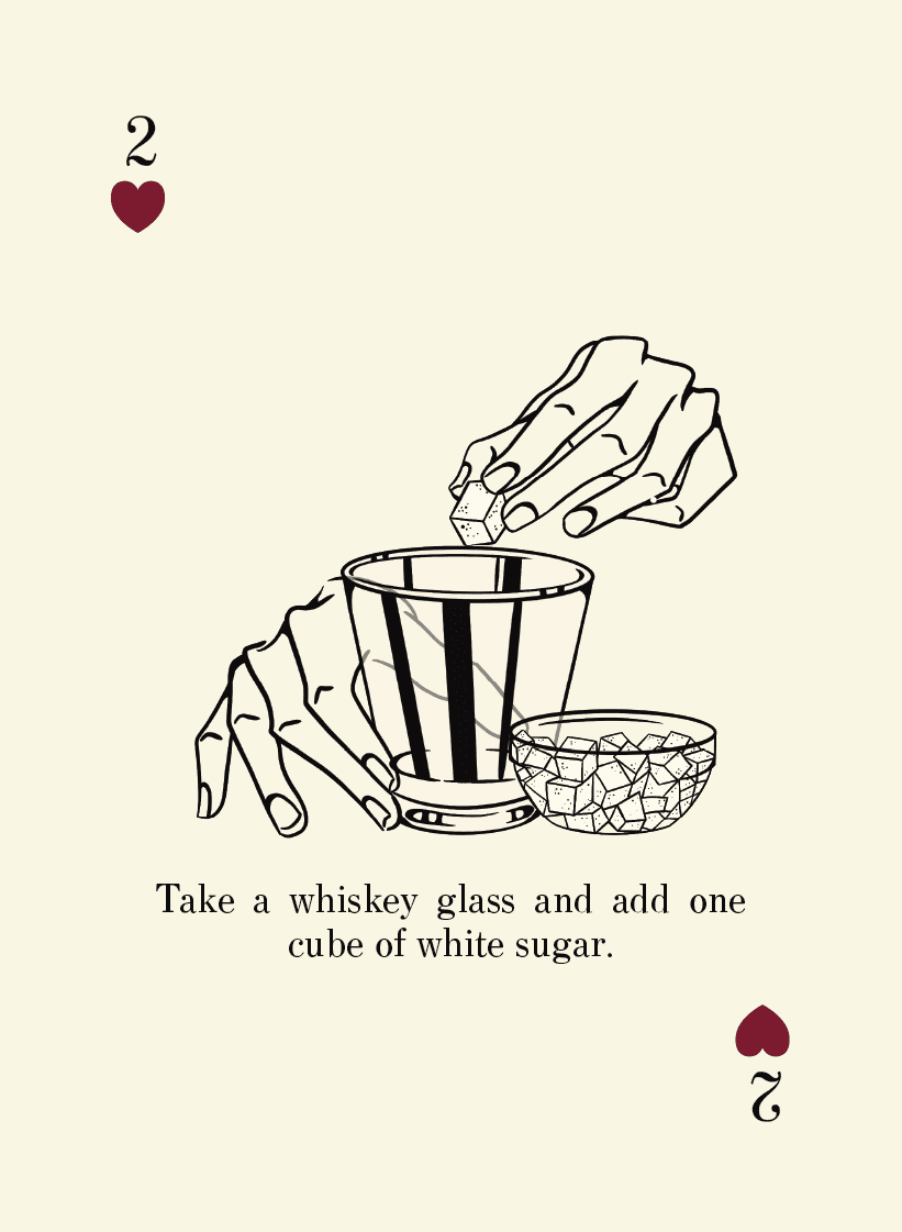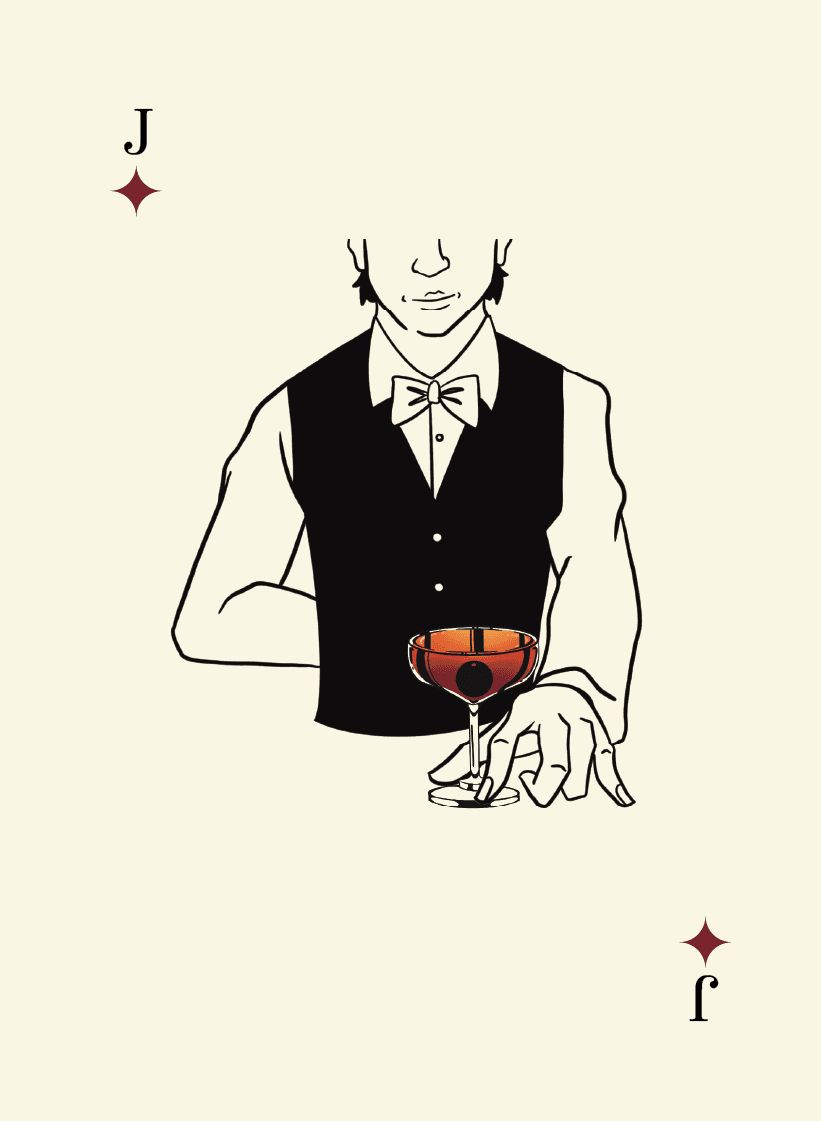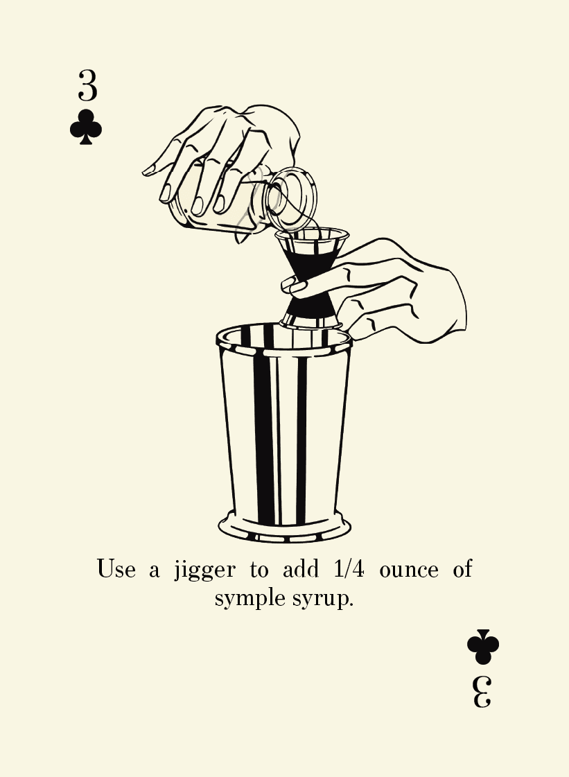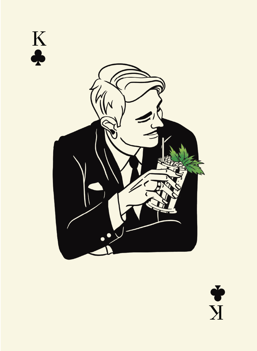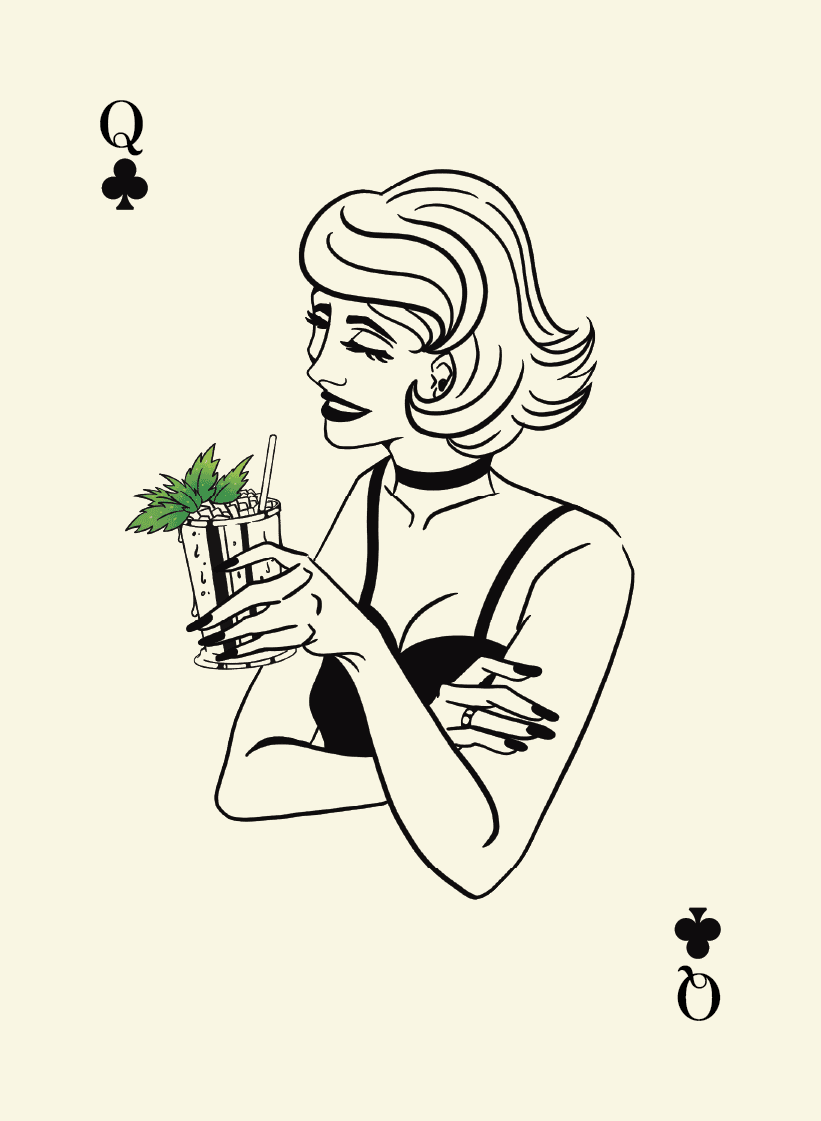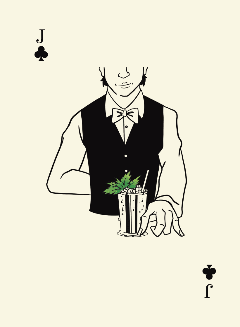 For each suite, the process is carried out across cards 2-10, with the ace showing the end result. Jack is a faceless bartender serving the cocktail, while the king and queen share the drinks.