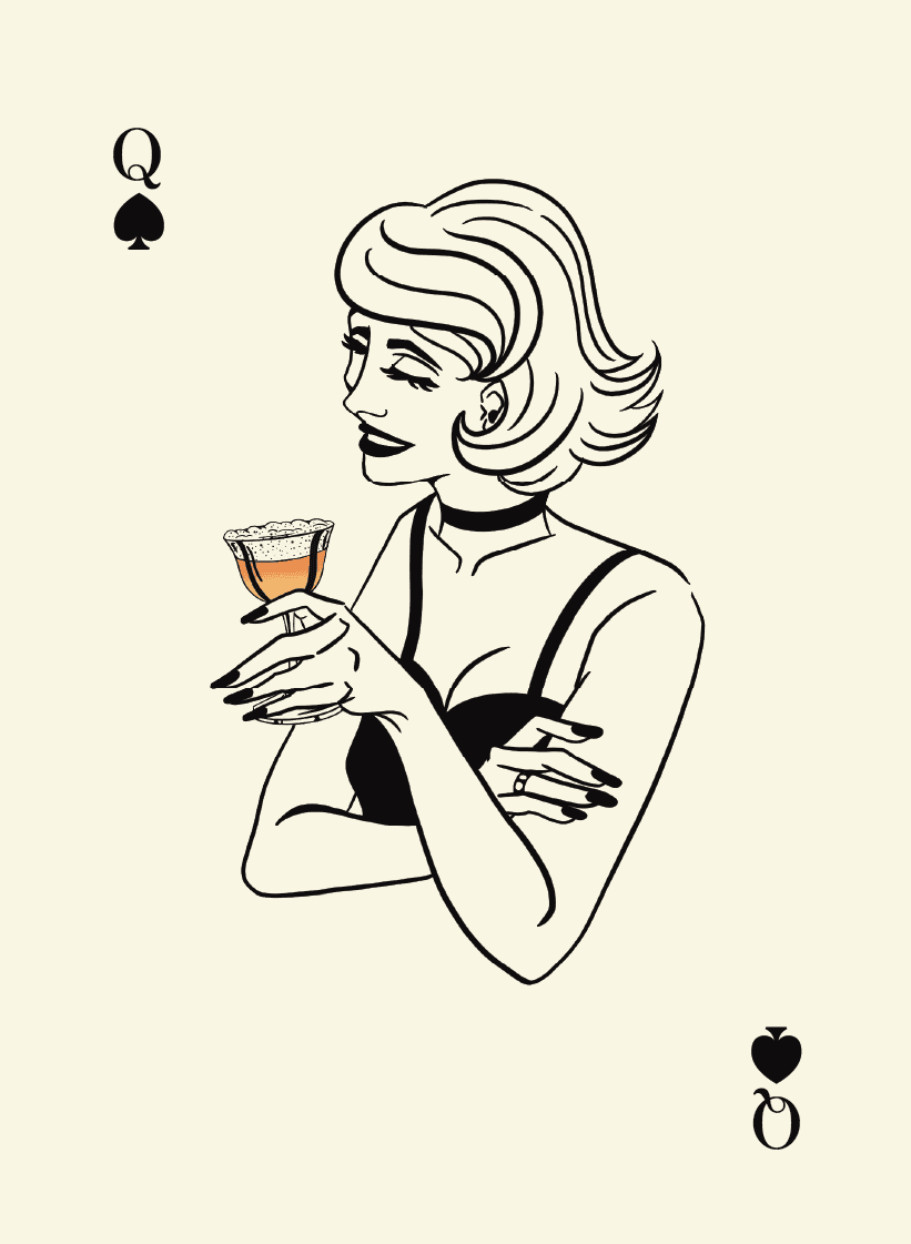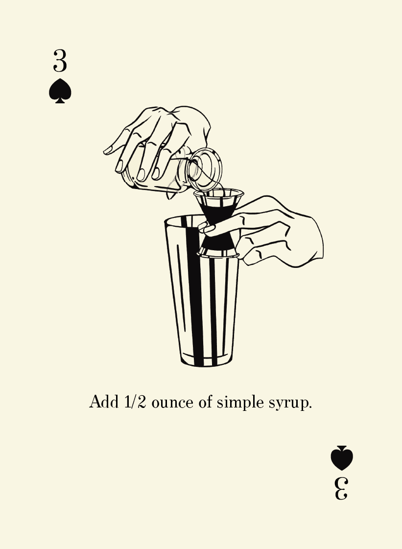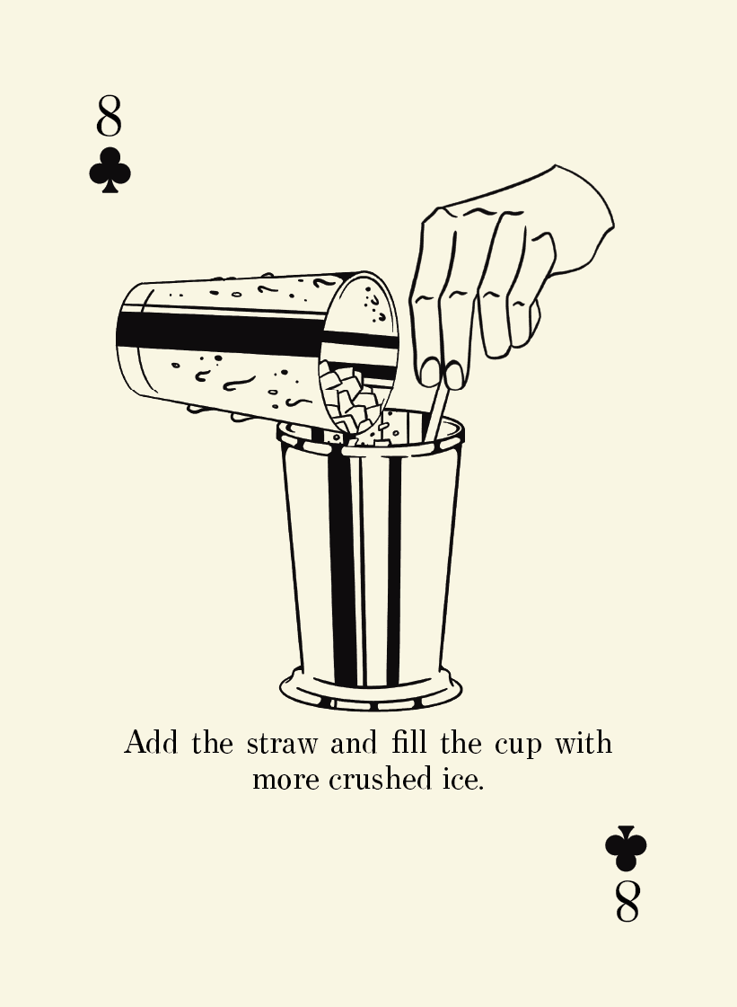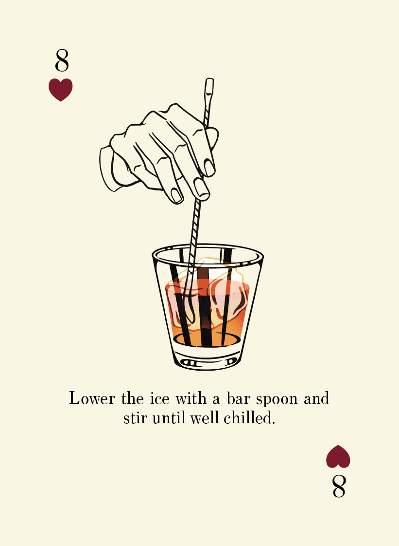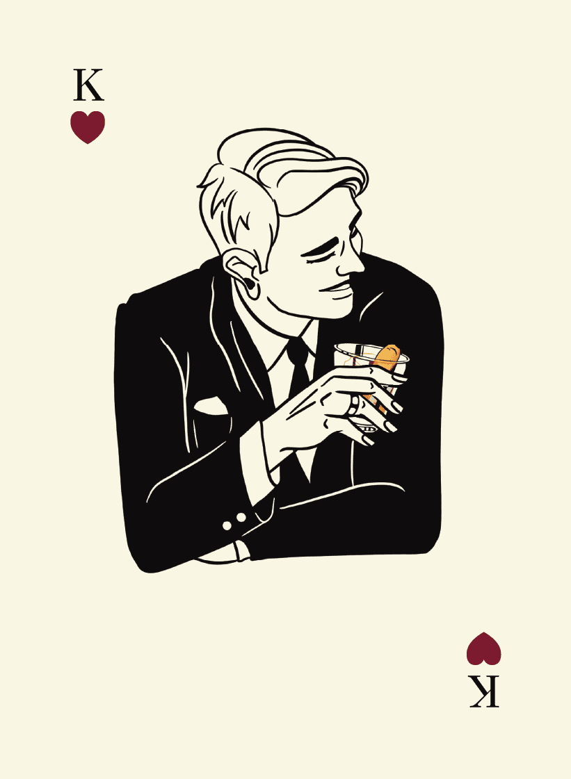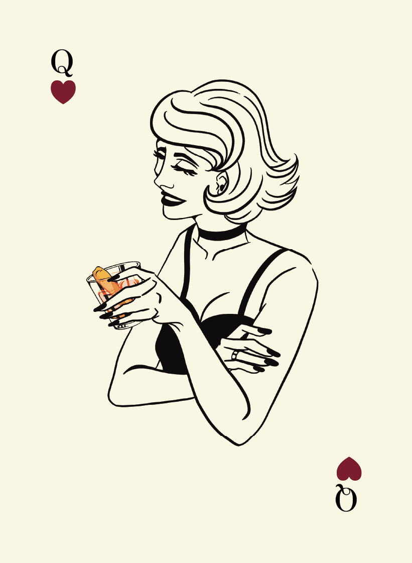 For each suite, the process is carried out across cards 2-10, with the ace showing the end result. Jack is a faceless bartender serving the cocktail, while the king and queen share the drinks.
