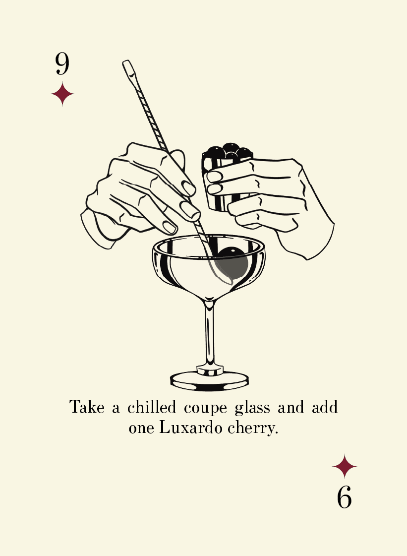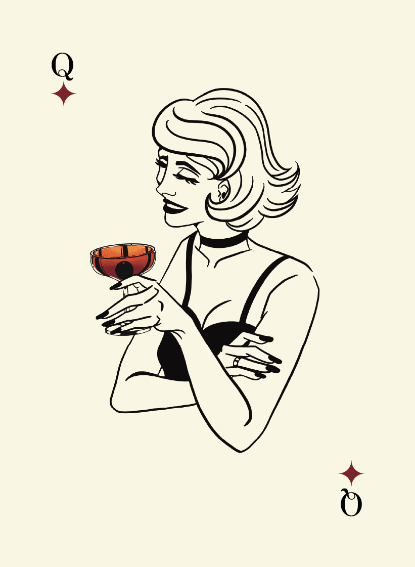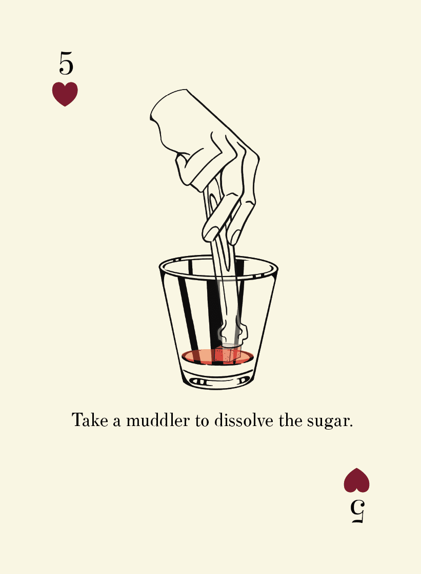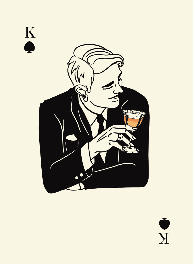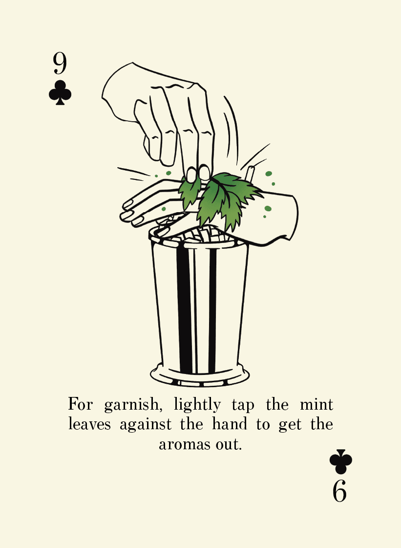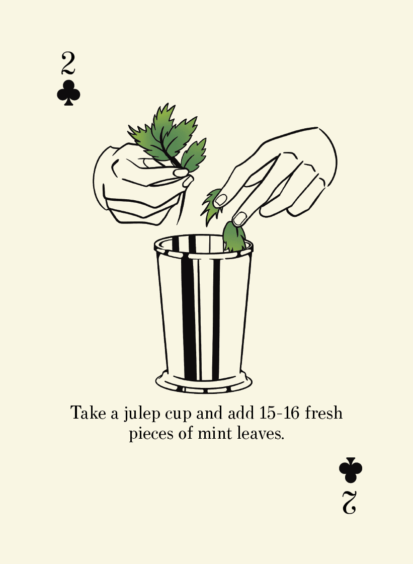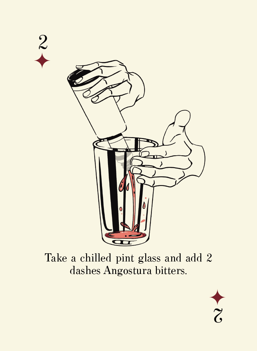 For each suite, the process is carried out across cards 2-10, with the ace showing the end result. Jack is a faceless bartender serving the cocktail, while the king and queen share the drinks.