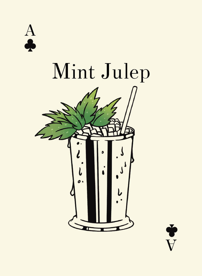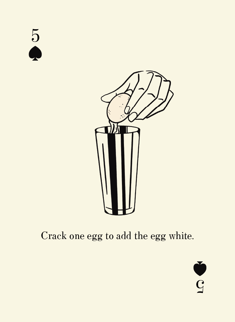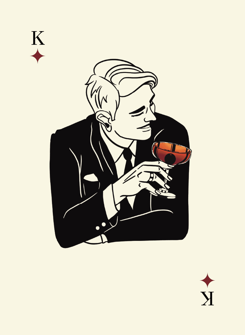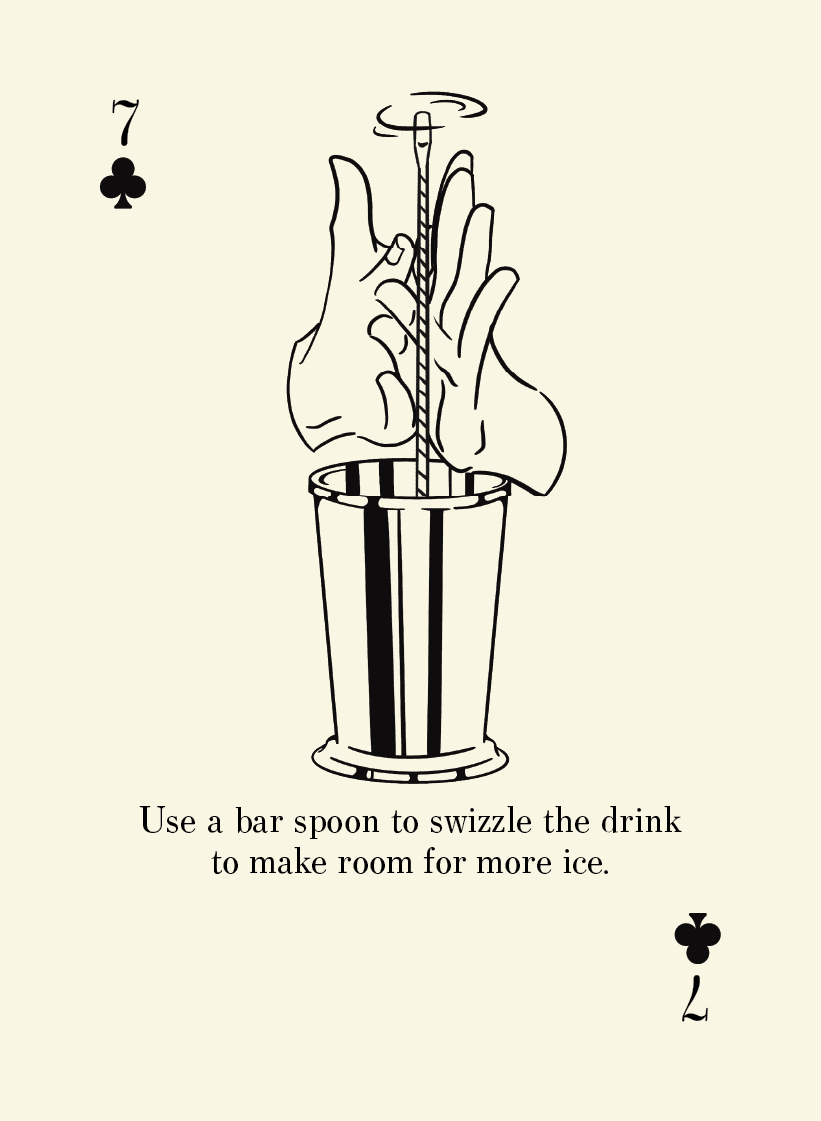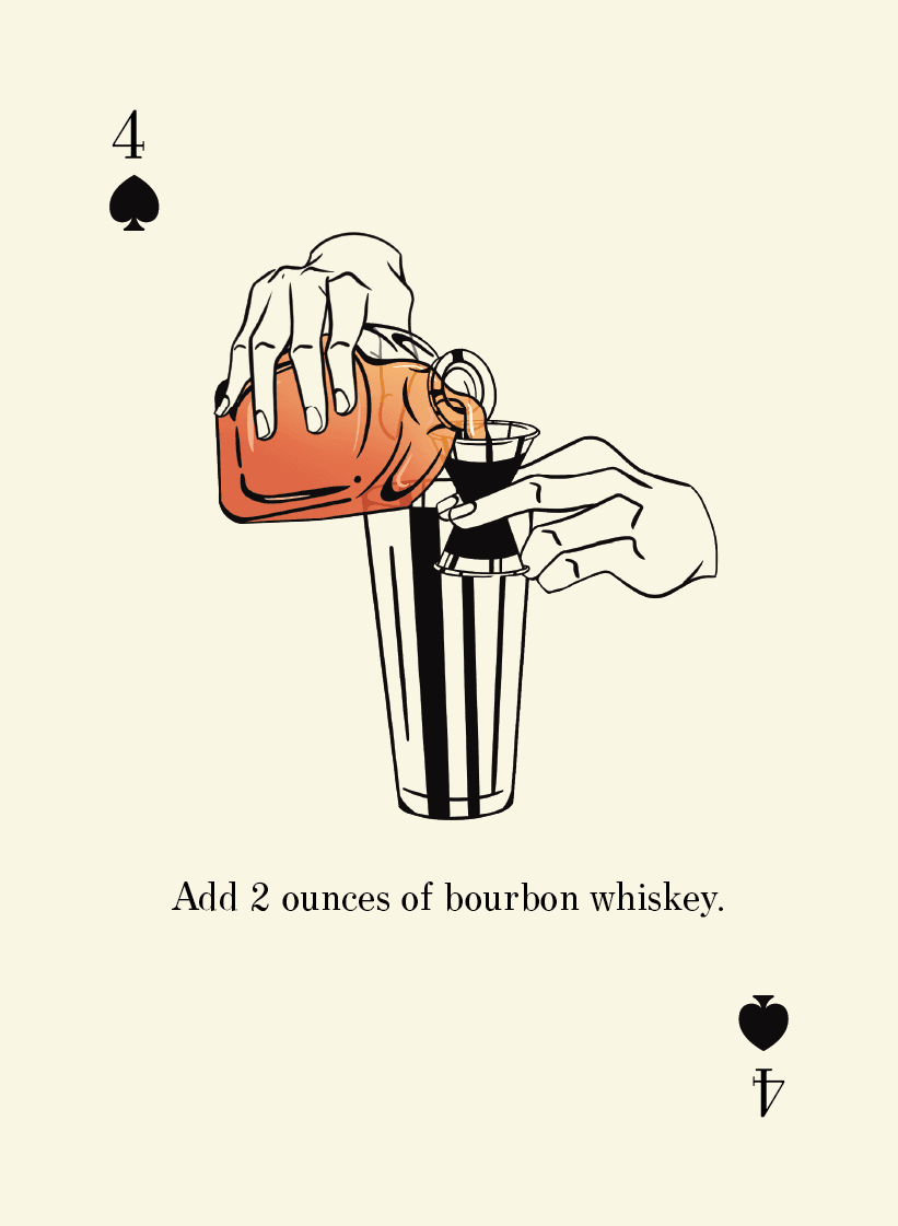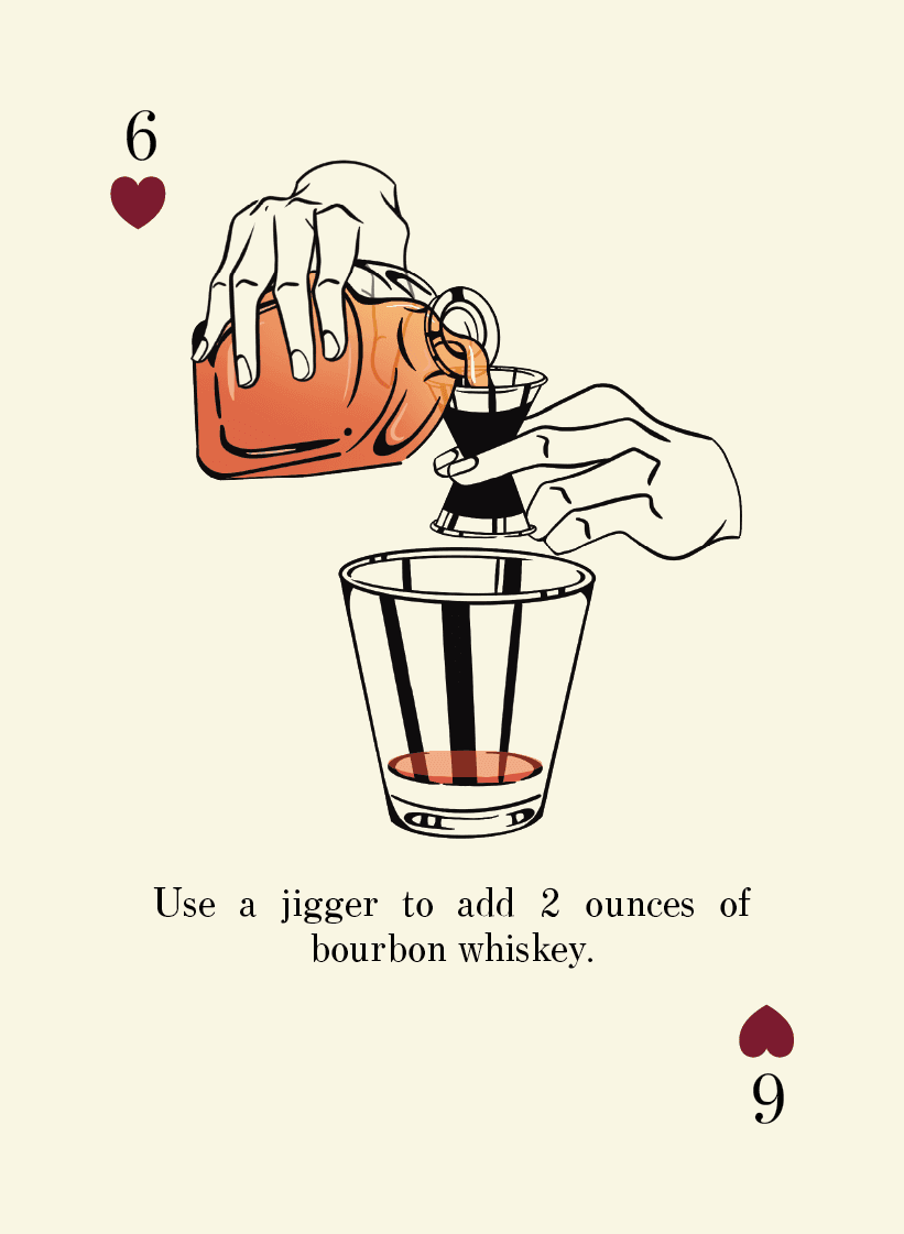 For each suite, the process is carried out across cards 2-10, with the ace showing the end result. Jack is a faceless bartender serving the cocktail, while the king and queen share the drinks.