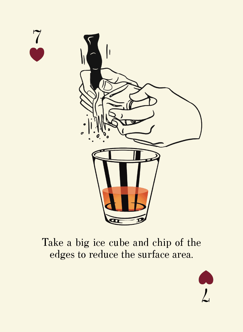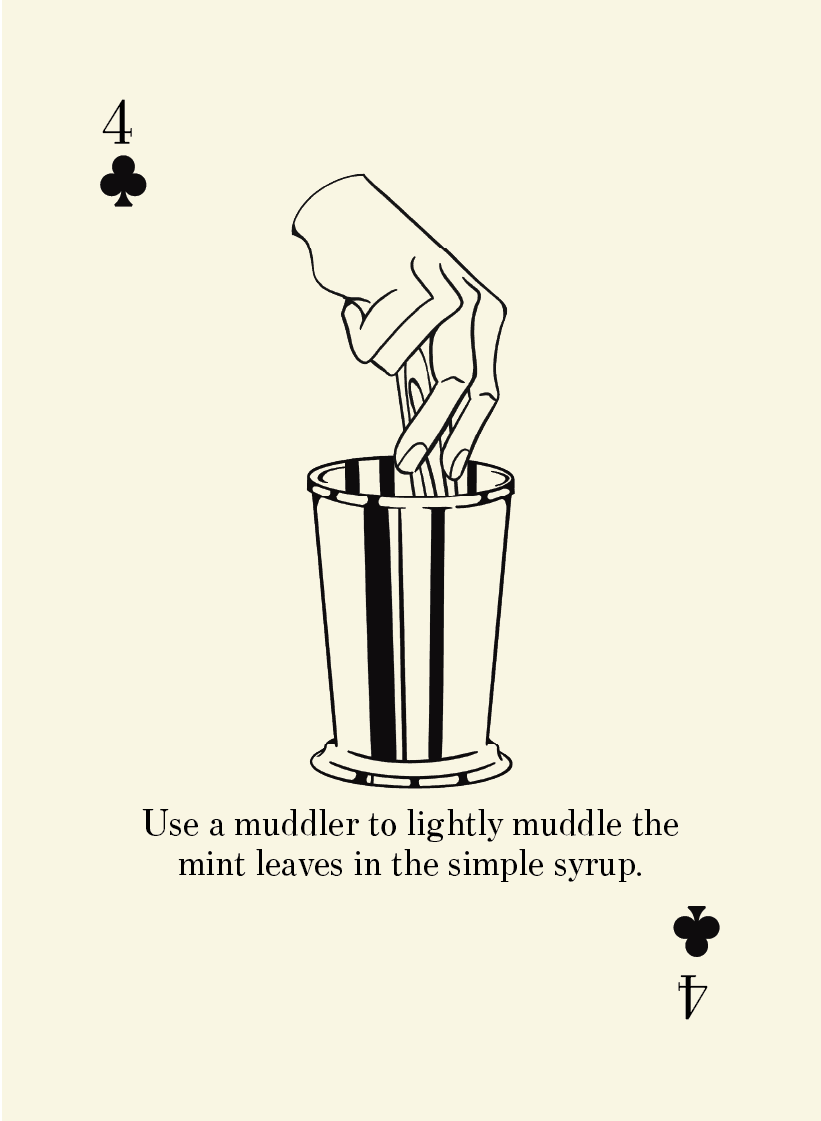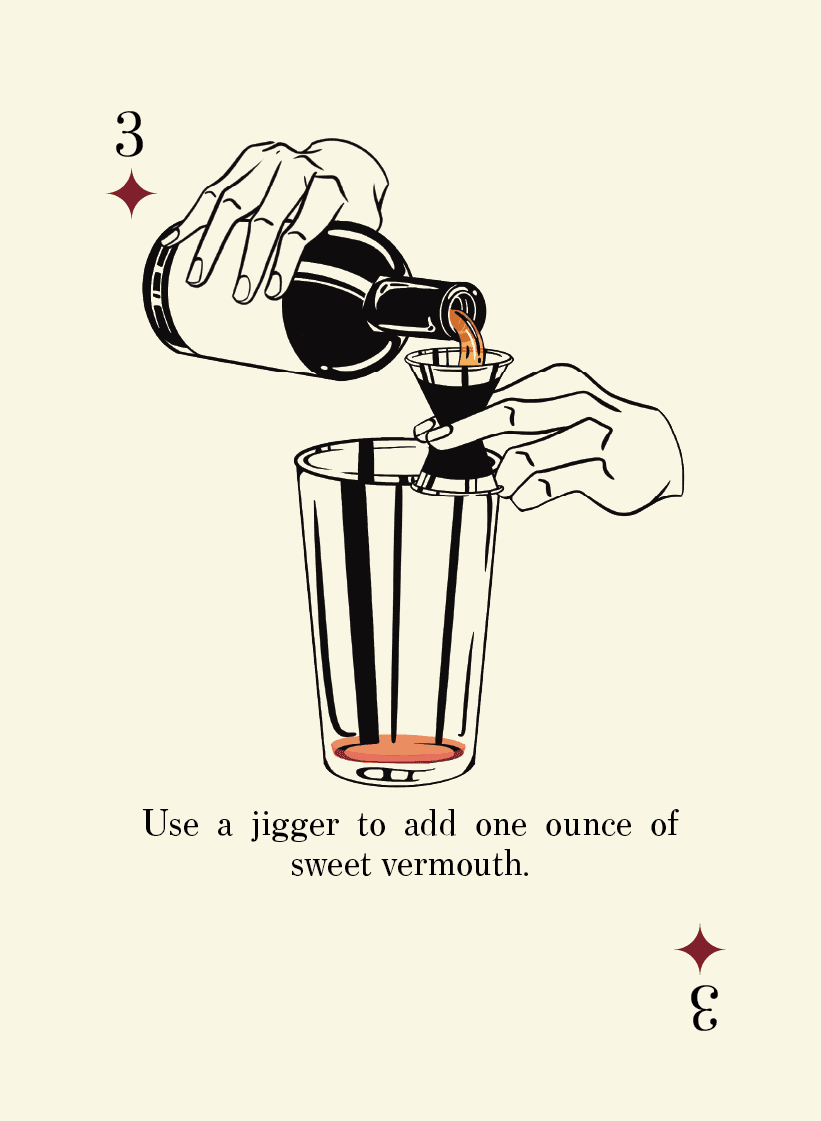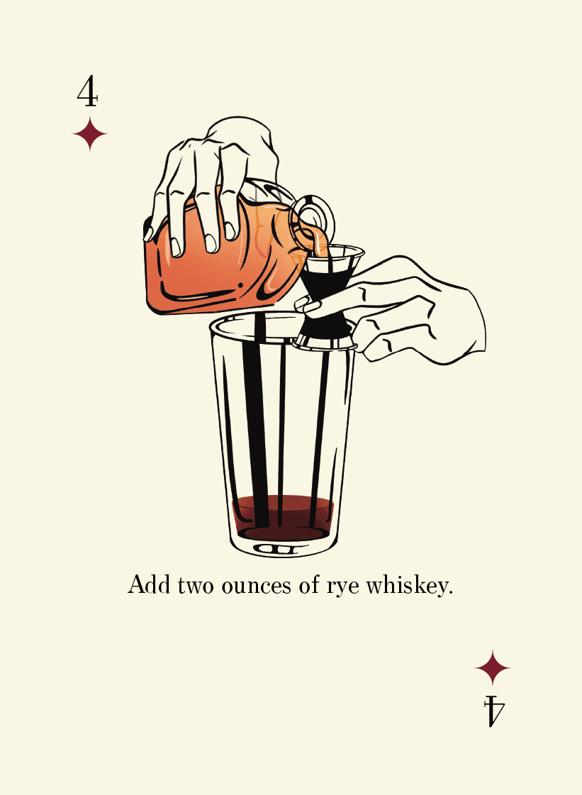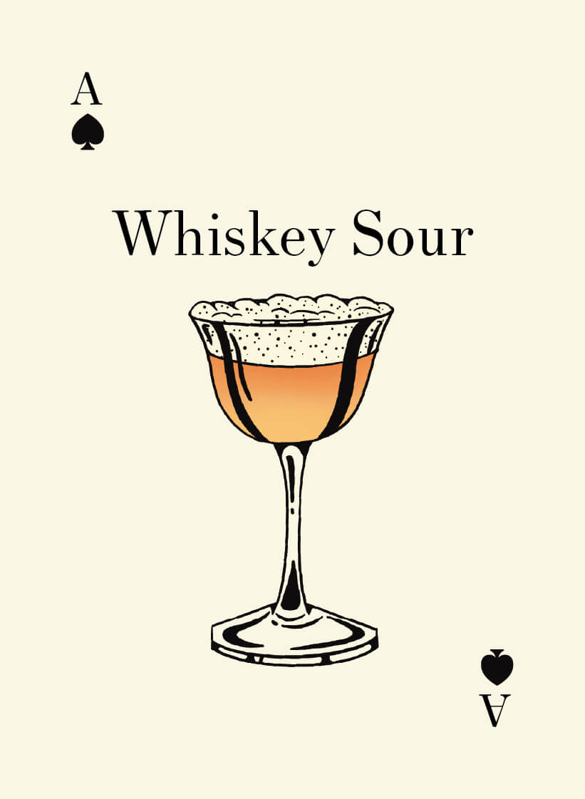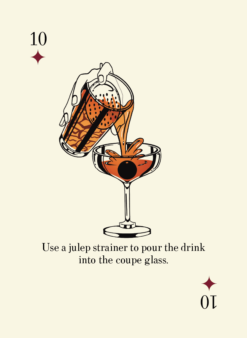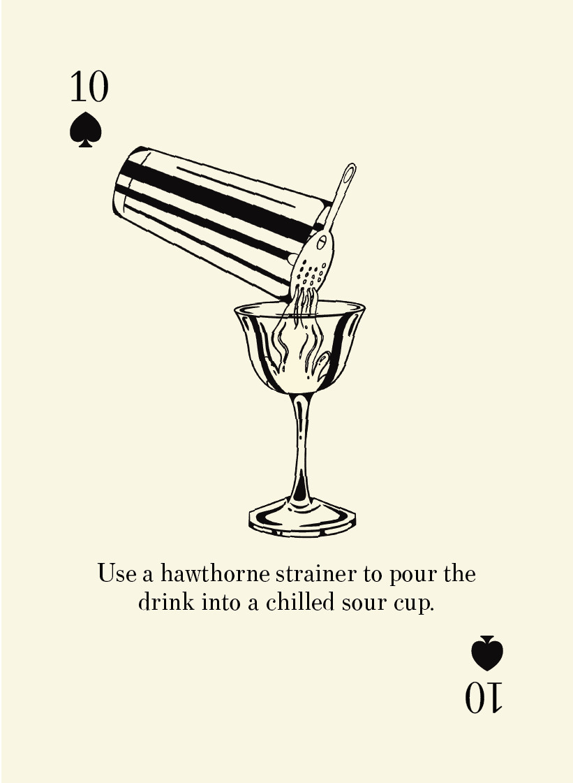 For each suite, the process is carried out across cards 2-10, with the ace showing the end result. Jack is a faceless bartender serving the cocktail, while the king and queen share the drinks.