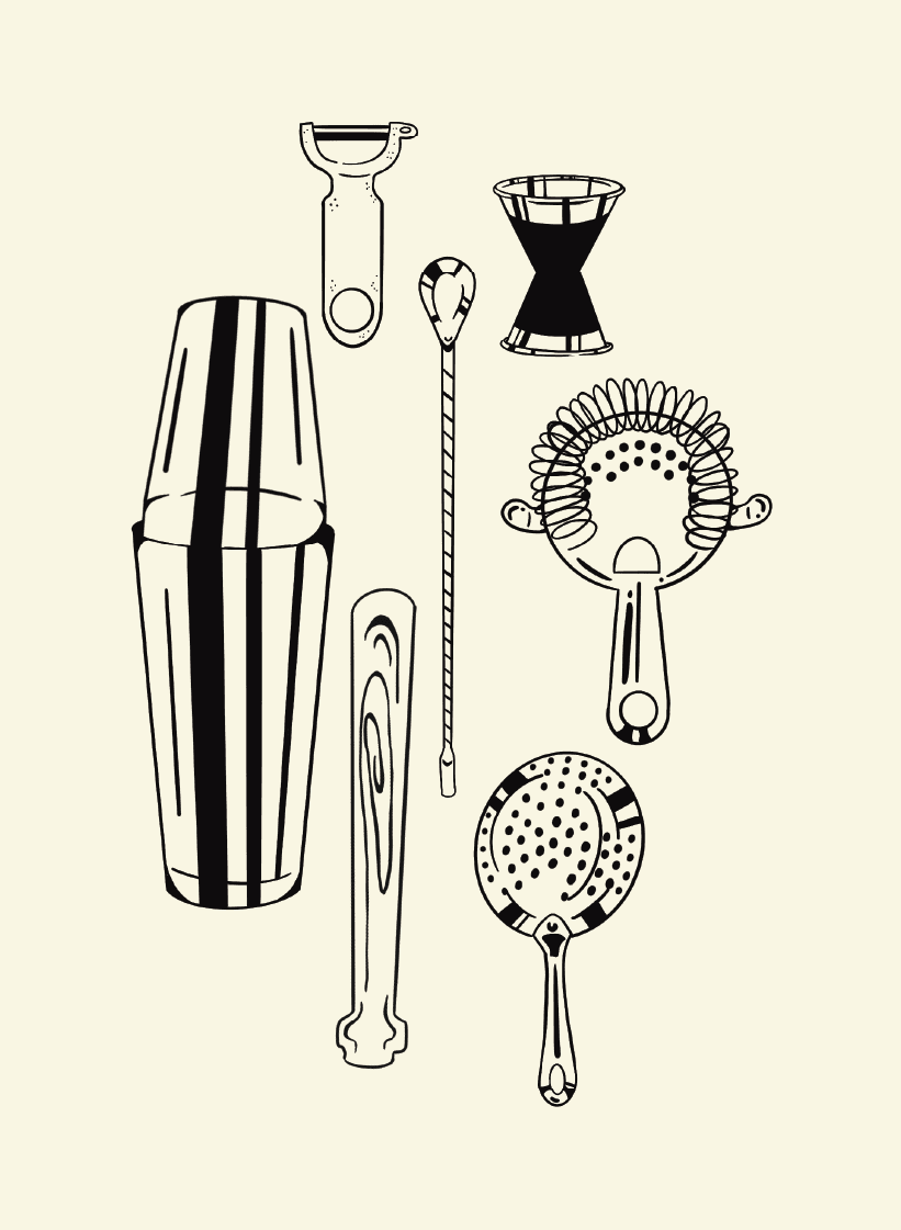 Lastly, a line-art style in black and white was chosen to draw more attention to the fully colored ingredients and drinks being made.